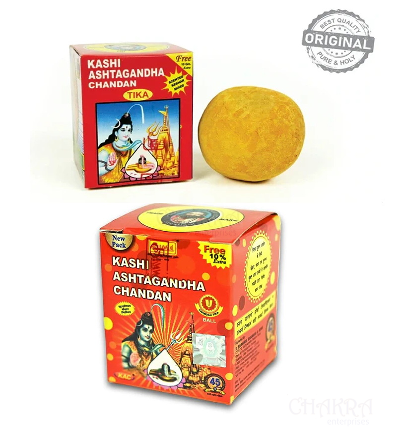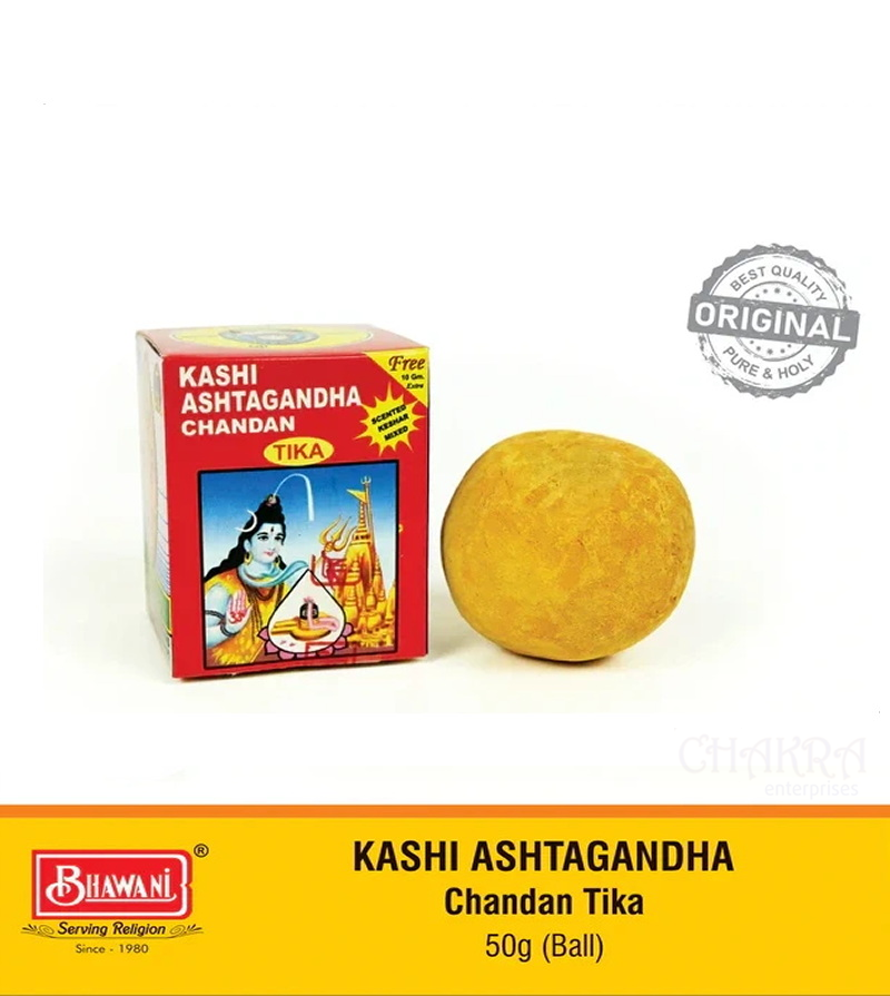 • Bhawani Kashi Ashtagandha chandan Tika is traditional tilak powder made with Pure Sandalwood, saffron and other natural herbs which used for all kind of Rituals & Prayers.