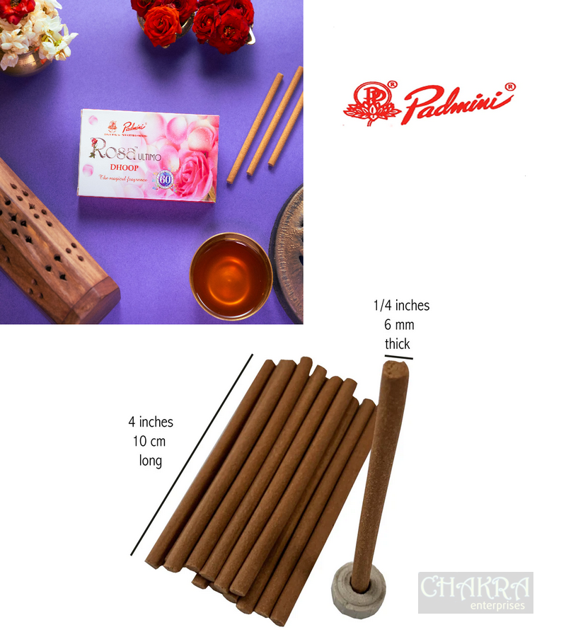 Elevate your space with our Rosa Ultimo Dhoop. Designed for spiritual ceremonies and deep meditation, these dhoop sticks release a floral and sweet rose fragrance, creating an atmosphere of luxury and tranquility. Perfect for purifying your surroundings and enhancing spiritual depth, the rich scent of Rosa Ultimo Dhoop is ideal for special occasions and significant spiritual events. A harmonious blend of floral and sweet notes, derived from natural rose essences. This distinctive fragrance fills your home with an opulent aroma, perfect for meditation and enhancing your spiritual practices.