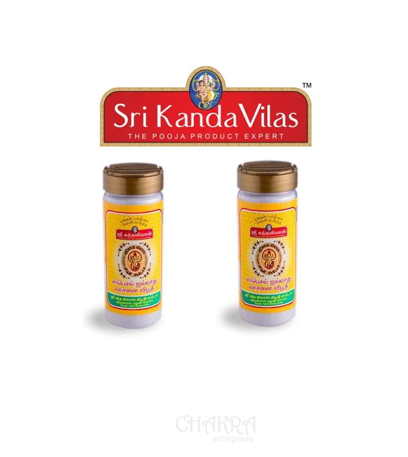 Kanda vilas Vibhuti Scented Vibhuti is a special vibhuti made from cow dung, dried under the sun, and burned. The ash collected is mixed with Javadhu and other aromatic substances.